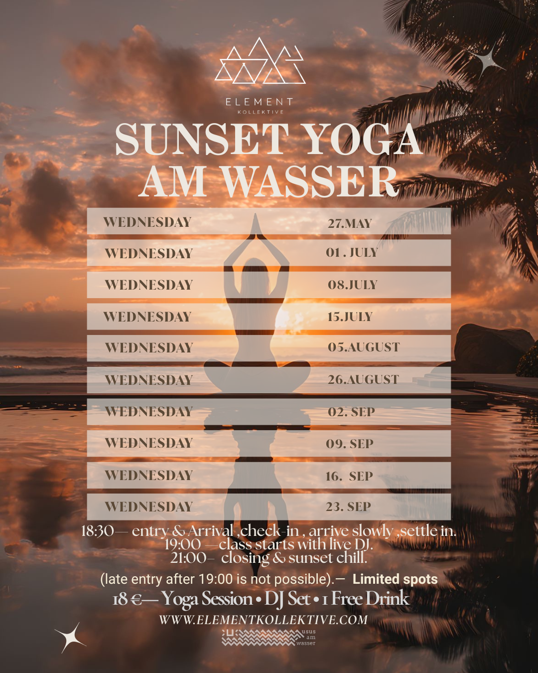 🌅 After Work Sunset Yoga 2026 — Element Kollektive × Usus am Wasser Unwind after work with yoga by the water, guided by professional teachers and accompanied by live DJ sunset vibes. Enjoy a unique beach atmosphere at Donauinsel — including one soft drink with your ticket. Move, breathe and connect. Limited spots.